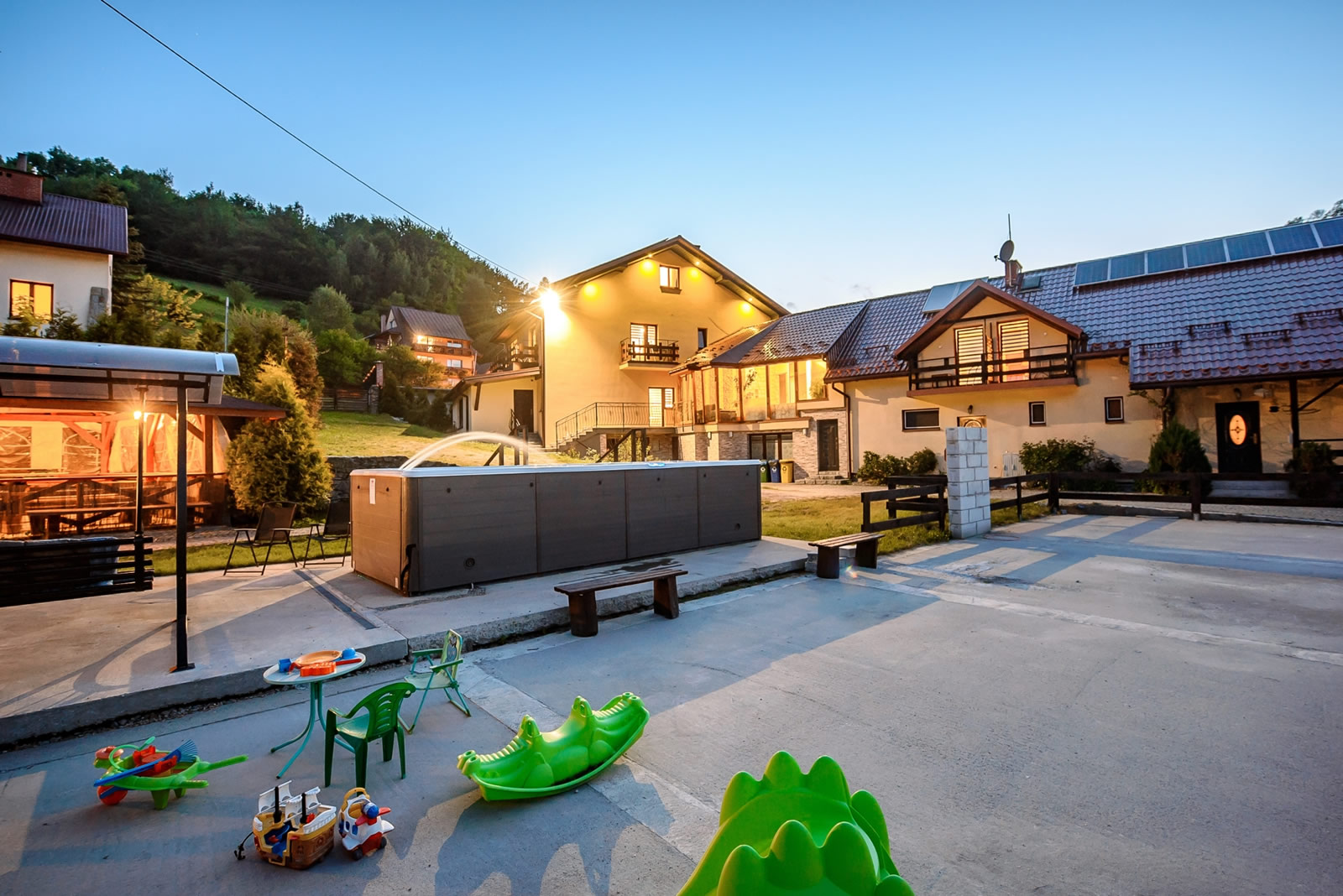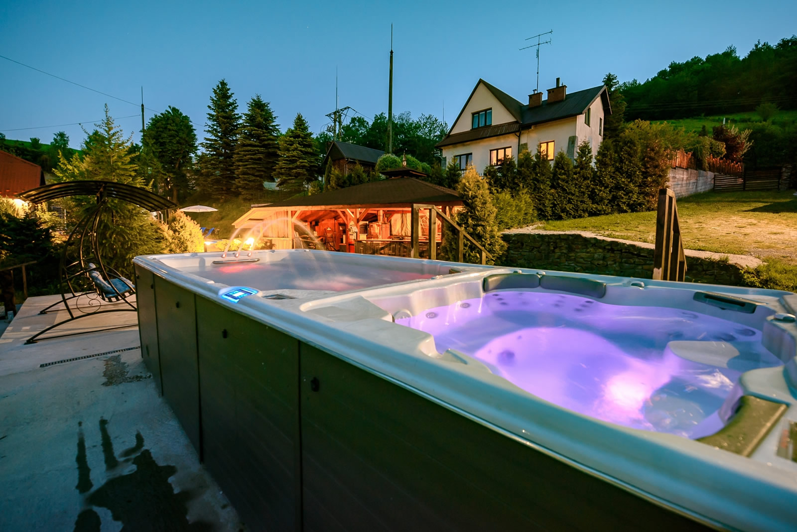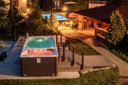 - Przestronne, wieloosobowe jacuzzi: Idealne na romantyczny wieczór we dwoje lub relaks z przyjaciółmi. Bąbelki delikatnie masują ciało, łagodząc bóle mięśni i stres.