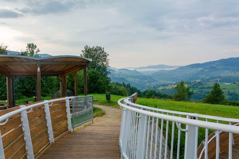 Typ atrakcji: Platforma widokowa Ślimak w Beskidzie (konstrukcja o spiralnym kształcie).